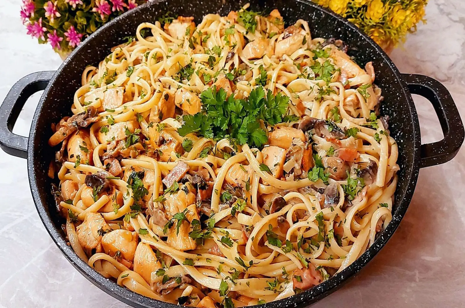 If you love comforting pasta dishes, this creamy chicken pasta with mushrooms and bacon is going to be your new favorite weeknight dinner! Tender chicken breast pieces are simmered in a rich cream sauce with garlic, onion, and mushrooms, then tossed together with perfectly cooked linguine. The touch of bacon adds a smoky surprise, making every bite irresistible. This recipe is easy, delicious, and ready to impress both family and guests.